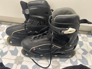 Se venden patines en línea Oxelo de color negro. - Talla ajustable de 38 a 41. - Cierre con cordones, velcro y hebilla. - Ruedas de poliuretano.