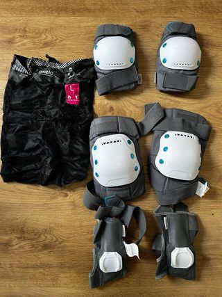 Nuevos. Set de protecciones Oxelo para patinaje en talla L. Incluye rodilleras, coderas y muñequeras. - Diseño en color gris con detalles en azul. - Cierre de velcro ajustable. - Placas protectoras blancas.