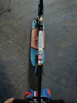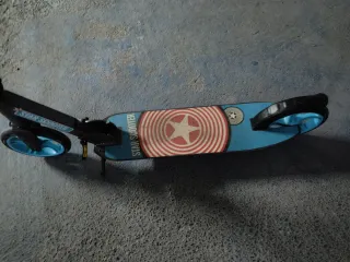 Patinete infantil con diseño de Star Scooter. - Plataforma azul con diseño de estrella. - Ruedas de color azul. - Manillar negro con detalles blancos. Se pueden montar un adulto y un niño. Es fuerte y resiste bastantes kilos Buen estado Se incluye la bolsa del manillar Se puede ver sin compromiso ya q las fotos no salen muy bien . NO ENVIO SOLO EN MANO