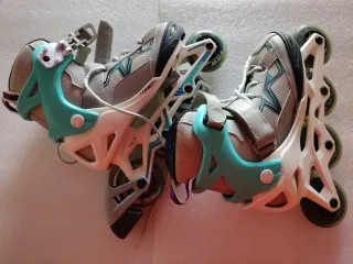 Patines en línea para niños o adultos jóvenes. Son cómodos y seguros para iniciarse en el patinaje. - Color gris y turquesa. - Cierre de velcro y cordones. - Ruedas de 80mm. - Entrego Barcelona ciudad, zona plaza de Sanllehy
