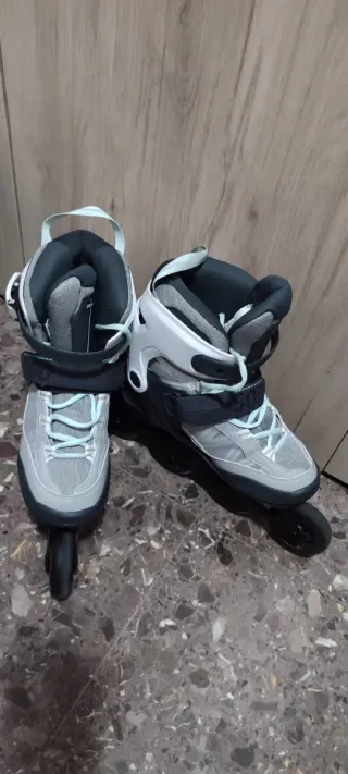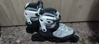 Patines en línea de color gris y blanco, con detalles en menta. Diseñados para adultos. - Ruedas de poliuretano. - Cierre de velcro y cordones. - Bota acolchada para mayor comodidad. Talla 37