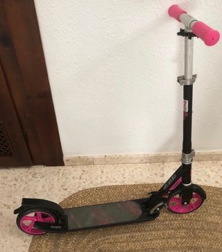 Se vende patinete infantil Oxelo decathlon de color fucsia para niños de 2 a 5 años. Está diseñado para niños de 80 cm a 1,15 m, tiene freno de pie en la rueda de atras, se puede desmontar para su transporte y el manillar se puede ajustar a diferentes alturas. Aunque esta usado, esta en muy buen estado.