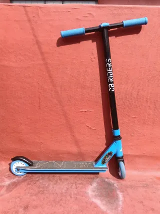 Patinete de acrobacias en color azul y negro. - Manillar con puños azules. - Plataforma con diseño gráfico. - Ruedas delanteras y traseras.