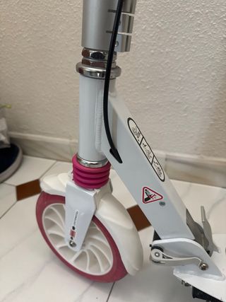 Patinete en perfecto estado, ideal para niños y niñas de 9 a 14 años. - Color blanco con detalles en rosa. - Manillar ajustable. - Ruedas de goma para un mejor agarre.