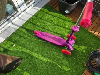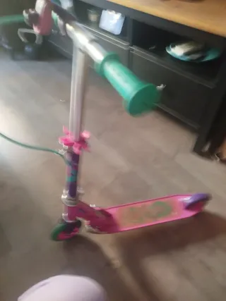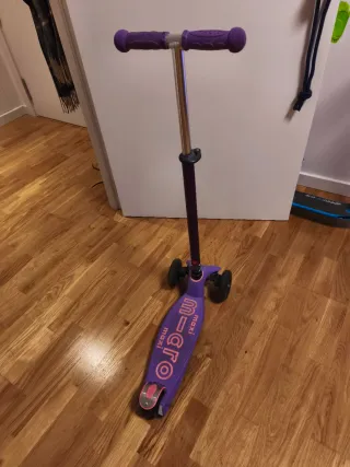 Una de las ruedas no se ilumina Lo demás está bien Funciona bien. Patinete de tres ruedas en color morado, ideal para niñas. - Tres ruedas para mayor estabilidad. - Manillar ajustable en altura. - Empuñaduras de goma para un agarre cómodo.