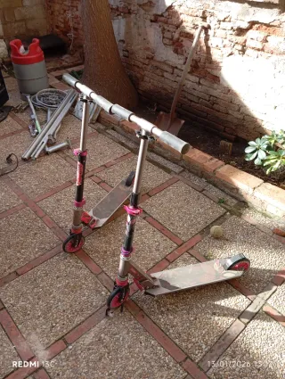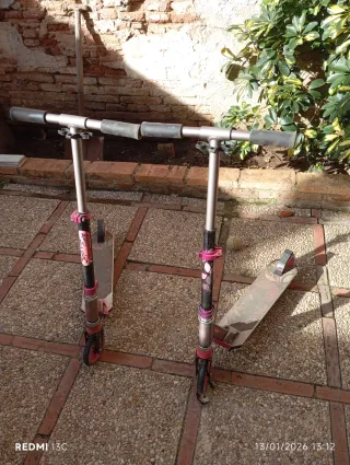 Se venden dos patinetes infantiles en color rosa. Son perfectos para que los niños se diviertan al aire libre. - Estructura metálica. - Ruedas de goma. - Puños de goma para un mejor agarre.