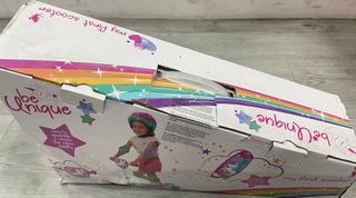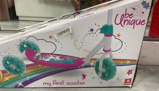 Patinete infantil My First Scooter de Mondo Toys, con diseño Be Unique y temática de unicornios y arcoíris. - Fácil de montar. - Diseñado para 3 ruedas para mayor estabilidad. - Incluye casco y protecciones para rodillas y codos. Se vende porque me equivoqué de edad este patinete es para niñ@ de 3 o 4 o 5 años y mi hija tiene 6 si te interesa venir en persona en Barcelona llámame al 678184955 está nuevo