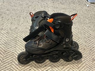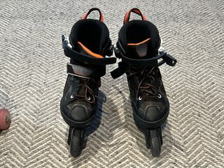 Patines en línea de la marca Oxelo, diseñados para niños. Son de color negro con detalles en naranja. - Cierre de velcro y hebilla. - Ruedas de poliuretano. - Bota acolchada y ajustable para mayor comodidad. - Marca: Oxelo Roller fit 3 jr black orange - Talla: 32-35 - Se vende con protectores, si se precisa. (+5€) Precio actual Decathlon: €44,99