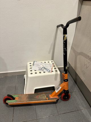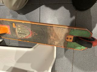 Patinete infantil de la marca Slamm en color naranja. Ideal para niños 7-11 años. Le faltan los 3 tornillos que sujetan el manillar, se pueden encontrar en cualquier ferreteria. - Plataforma ancha para mayor comodidad. - Ruedas de goma para un buen agarre. - Manillar ajustable en altura.