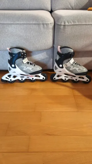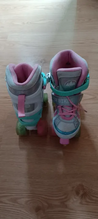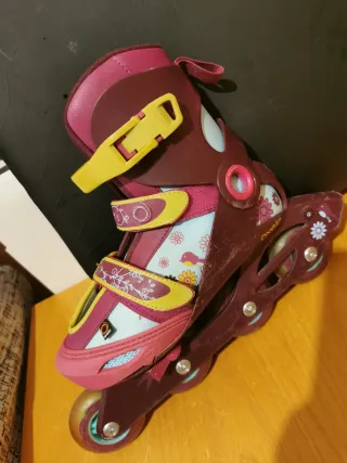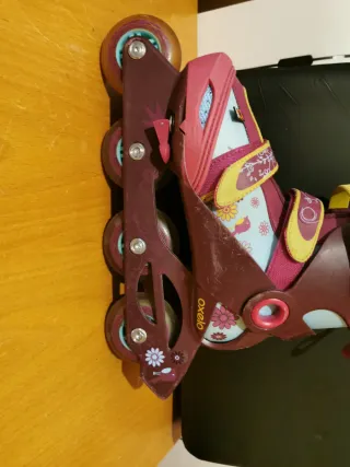 Patines infantiles de la marca Oxelo en color rosa y azul. - Talla 26-28. - Cierre de velcro y hebilla. - Ruedas de patinaje en línea. Las traseras se pueden cambiar de posicion.