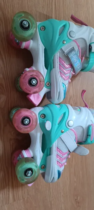 Set de patines de 4 ruedas para niña. - Diseño en color blanco, turquesa y rosa. - Ruedas con brillos. - Cierre de velcro y cordones.