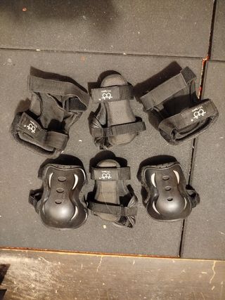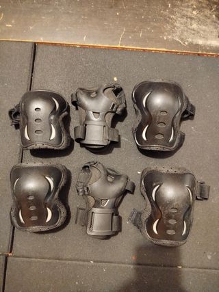 Juego de protecciones para patinaje, ideal para niños. Son seis piezas en total: dos rodilleras, dos coderas y dos muñequeras. Están en buen estado, aunque presentan algunas señales de uso. - Incluye 2 rodilleras. - Incluye 2 coderas. - Incluye 2 muñequeras. Para ADULTOS