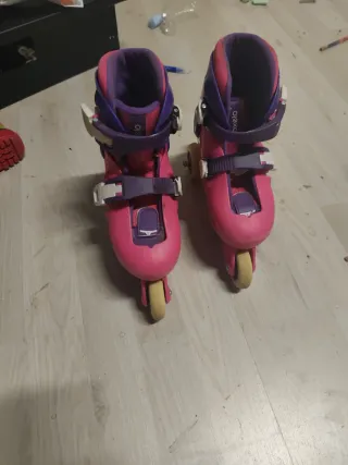 Patines en línea para niña en color rosa y morado. Talla ajustable 26-28. Con evidentes signos de uso pero con mucha vida útil aún. - Marca Oxelo. - Cierre con velcro y hebillas. - Ruedas de color claro.