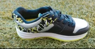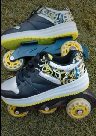 Zapatillas con ruedas para niños, ideales para divertirse. Talla 33 Rollerbepi. - Diseño deportivo en negro y plateado. - Detalles con estampado gráfico en amarillo y azul. - Suela blanca con borde amarillo. - Ruedas amarillas.