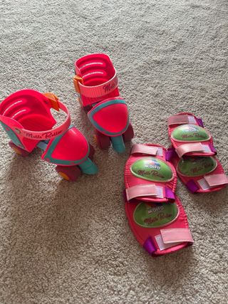 Set de patines de 4 ruedas ajustables y protecciones de la marca MOLTO modelo My First Skate. - Patines ajustables de la talla 25-32. - Con freno delantero y cierre de seguridad. - En color rosa y turquesa. - Incluye rodilleras y coderas a juego. - Medidas: 11 cm x 23 cm x 28 cm. - Recomendado para + 3 años. - PVP: 27€ Tienen solo 2 usos, la niña los quiere lilas y no hay manera... jajajaja SE ENVÍAN EL MISMO DÍA