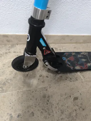 Patinete infantil de Decathlon con manillar ajustable. Sistema ajustable y de fácil almacenamiento. Para altura de niños de ente 1.10 a 1.50 para niños de 6 a 9 años. - Color azul y negro. - Ruedas de goma. - Plataforma antideslizante.