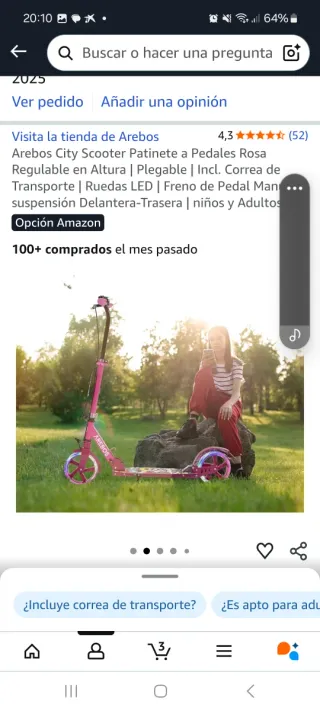 Patinete Arebos City en color rosa, ideal para niños y adultos. Es plegable y regulable en altura. - Ruedas con luces LED. - Incluye correa de transporte. - Freno de pedal manual. - Suspensión delantera y trasera. - No lleva timbre