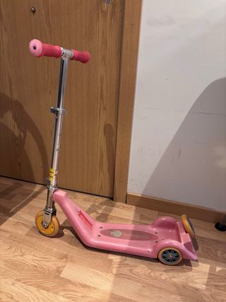 Patinete infantil de la marca Oxelo, adquirido en Decathlon. Ideal para iniciarse en el patinaje. - Puños de goma en color rosa. - Manillar ajustable en altura. - Estructura metálica plateada. - Esta muy usado pero nada partido.El.precio es simbolico