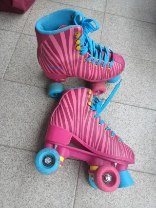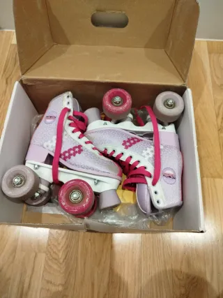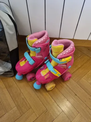 Se venden patines de 4 ruedas, ideales para iniciarse en el patinaje. El diseño es llamativo y divertido. Talla 30. Son de buena calidad. Usados pero en buen estado. - Diseño con brillos y cordones rojos. - Ruedas y frenos en color rojo. - Estampado de ciudad y árboles en la caja.