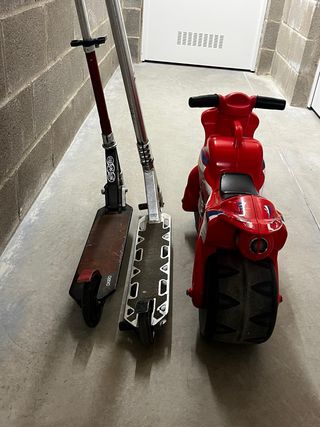 Se venden dos patinetes infantiles, ideales para que los niños disfruten al aire libre. -una moto - El otro patinete tiene la base metálica con diseño. - Ambos cuentan con manillar ajustable y ruedas para su desplazamiento. Se vende suelto.