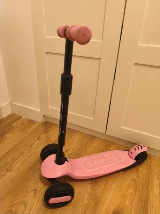 Patinete infantil de tres ruedas en color rosa, marca 'Sawyer'. Ajustable, para niños entre 2 y 6 años. Luces led en las 3 ruedas. En buen estado. - Ruedas delanteras dobles para mayor estabilidad. - Manillar con empuñaduras ergonómicas. - Plataforma antideslizante.