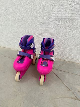 Patines infantiles Oxelo en color rosa y morado, talla 26-28. Han tenido muy poco uso. - Cierre con velcro y hebilla. - Ruedas de patinaje en línea. - Convertible de linea a como se ve en la imagen para iniciación. Tornillos incluidos para tal fin