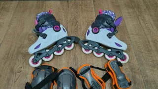 Set de patines en línea para niña marca Oxelo, modelo Play 5, de Decathlon. Incluye protecciones. - Patines ajustables en talla 30-32 - Diseño en blanco, morado y rosa. - Incluye rodilleras, coderas y muñequeras (falta 1 pieza) Están en buen estado, con poco uso, como se ve en las fotos.