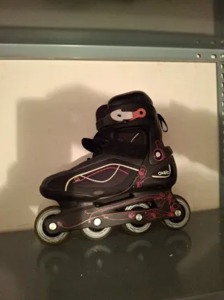 Patines en línea Oxelo Play 3 en color rosa, ideales para niñas. - Talla ajustable de 26 a 28. - Diseño con tres ruedas alineadas o no para mas estabilidad - Cierre de velcro y hebilla para un ajuste seguro. - Ruedas de color blanco.