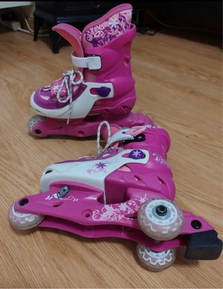 Patines en línea Poy Dash en color rosa y negro, ideales para niños. Son ajustables para adaptarse al crecimiento. - se imuminan las ruedas - Diseño deportivo. - Cierre de velcro y hebilla. - Ruedas resistentes. Los usé una vez y por eso tiene algún rallajo, q se ve en las fotos.