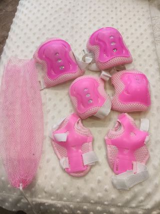 Set de rodilleras y coderas para niña en color rosa. - Diseño con detalles brillantes. - Cierre ajustable con velcro. Pack de rodilleras, coderas y muñequeras rosas para niña. Diseño coqueto con diamantino decorativo en el centro. Usadas solo un par de veces, están impecables. Muy cómodas y seguras para patinar, montar en bici o hacer skate. Incluye bolsa de malla rosa para guardarlas. Perfectas para niñas que quieren protegerse con estilo. Protección, color y encanto en un solo pack. Hago envíos.