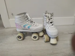 Se venden patines blancos de caña alta, ideales para iniciarse en el patinaje. - Diseño deportivo con detalles iridiscentes. - Cierre con cordones para un ajuste seguro. - Ruedas resistentes para un deslizamiento suave.