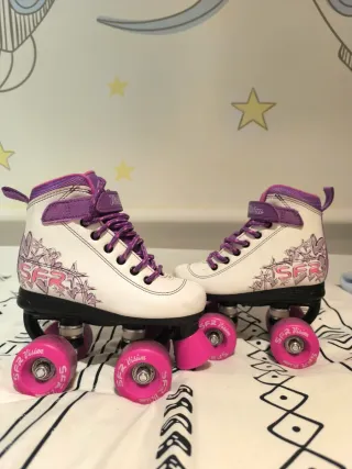 Patines de niña en color blanco con detalles morados y ruedas rosas. -Usados sólo 1 vez porque la peque se cayó y le cogió miedo. - Talla 29. - Cierre con cordones y velcro. - Diseño con estampado floral y logo SFR.
