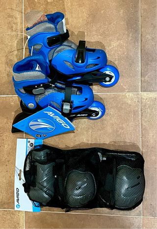 Set de patines en línea Avigo para niños, color azul, con protecciones. - Sin estrenar. - Patines ajustables- talla 26-30. - Incluye coderas y rodilleras niño talla M. - Marca Avigo. - Incluye funda