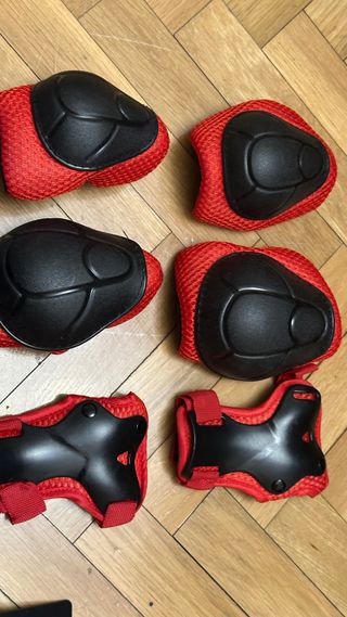 Set de protecciones para niños, ideal para patinaje, ciclismo o patinete. Incluye protecciones para rodillas, codos y muñecas. - Color rojo con detalles en negro. - Cierre con velcro ajustable. - Material resistente y acolchado.