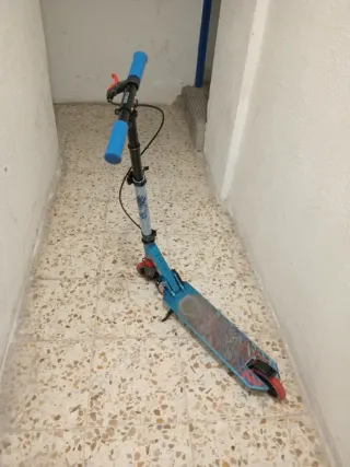 Patinete de Decathlon para niños, ideal para iniciarse en el patinaje. - Manillar ajustable en altura. - Ruedas de gran diámetro para mayor estabilidad. - Freno trasero. - Diseño plegable para facilitar su transporte y almacenamiento. Evidentes marcas de uso