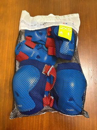 Set de protecciones para patinaje o bicicleta, talla 2XS. - Incluye protector de muñecas, rodilleras y coderas. - Color azul con detalles rojos. - Cierre con velcro. - Marca Oxelo. - Sin estrenar - Precio original 20€