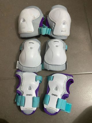 Set de protecciones para patinaje o skate, ideal para niños. Incluye coderas y muñequeras Todas XS 2 € la pareja 6 € todo (2 pares de coderas y 2 de muñequeras) - Diseño ergonómico. - Cierre de velcro ajustable. - Marca Oxelo.