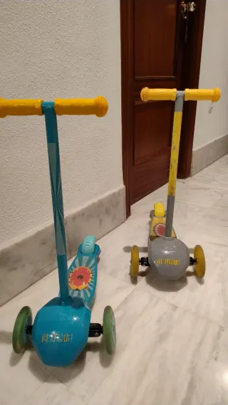 Se venden dos patinetes de iniciación. Ligeros para llevar sobre el carrito cuando el peque se canse. Usados durante un año por dos niños entre los 2 a los 3 años. Ideal para cuando se inician en lo patinetes. Todavía puede seguir usándose.