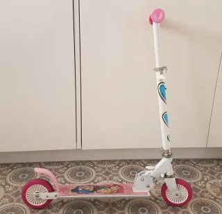 Patinete de dos ruedas con diseño infantil Princesas Disney. - Manillar ajustable en altura (3 posiciones) - Plegable. - Plataforma antideslizante. - Ruedas de goma. - Freno sobre rueda traser - Decoración con princesas Disney