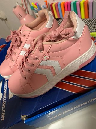 Patines de cuatro ruedas para niña, talla 35/36. Son de color rosa con detalles blancos y cordones turquesa. - Diseño con estampado floral blanco. - Cierre con cordones. - Ruedas de diferentes colores.