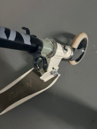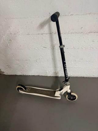Patinete de dos ruedas, ideal para niños. Su diseño es plegable para facilitar su transporte y almacenamiento. - Manillar negro ajustable en altura. - Plataforma blanca con detalles en negro. - Ruedas de color blanco.