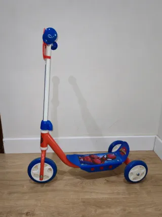 Patinete infantil de tres ruedas con diseño de Spiderman. Ideal para los más pequeños. - Base azul con estampado de Spiderman. - Ruedas de color azul y blanco. - Manillar ajustable con puños azules. - Estructura principal de color rojo.