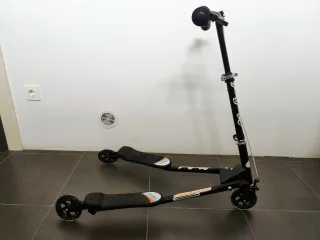 Patinete para niños plegable y regulable. Se puede plegar para ocupar menos espacio. Se puede regular más alto y mas bajo. La marca es Micro. Altura máxima aprox: 1 m.