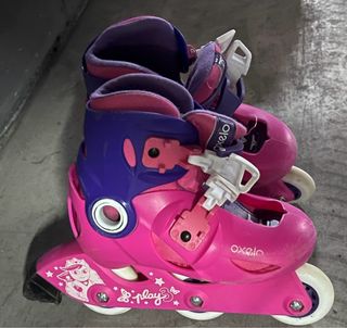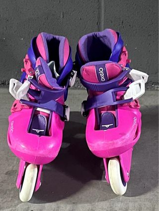Patines en línea Oxelo para niña, talla ajustable. Perfectos para iniciarse en el patinaje. Número 34/36 Tengo 2 pares idénticos - Diseño en color rosa y morado. - Cierre de velcro y hebilla. Patines usados con mínimos roces del uso pero bien conservados. Precio económico 1 par 6€ Los 2 pares 10€