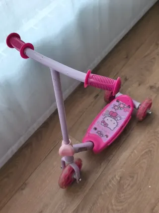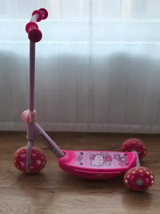 Patinete infantil de tres ruedas con diseño de Hello Kitty. - Color rosa y morado. - Plataforma con dibujos de Hello Kitty y flores. - Tres ruedas para mayor estabilidad.