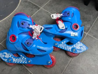Patines en línea Oxelo para niños, ajustables para adaptarse al crecimiento. - Ajuste muy sencillo. - Color rojo y azul. - Cierre con velcro y hebilla. - Ruedas en linea y recuerdo se podían poner dos atrás en paralelo. Para comenzar si se desea.