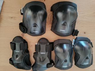 Juego de protecciones Oxelo para niñ@s entre 6 y 10 años (25-35 kg), ideales para actividades como patinaje. Están en muy buen estado. Solo un uso. - Incluye seis protecciones: dos rodilleras, dos coderas y dos muñequeras. - Son de color negro. - Marca Oxelo.