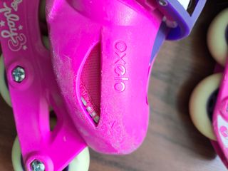 Patines en línea infantiles Oxelo Play, ideales para niñas de 3 a 6 años. Están en buen estado, aunque presentan algunos signos de uso. - Marca: Oxelo - Modelo: Play - Talla: Ajustable para niños de 3 a 6 años (28-30) - Color: Rosa y morado - Incluye dos patines.