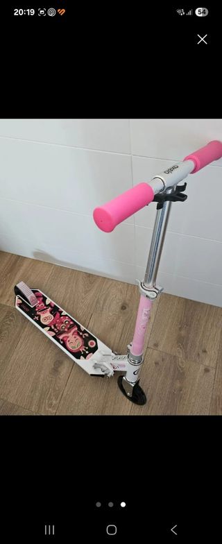Patinete de dos ruedas, ligero y fácil de manejar. Ideal para niños y niñas a partir de 6 años. Está limpio y en buen estado de uso, con base decorada y freno trasero funcional. Mide 85 cm de alto (máximo). 📍Entrega en mano en Madrid (zona Arganzuela).