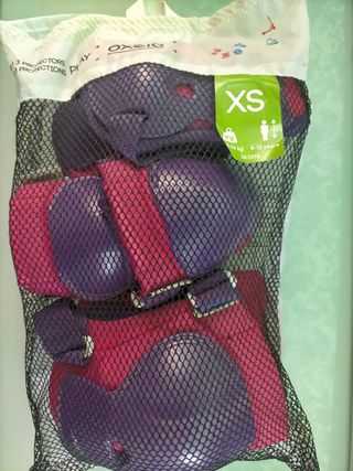 Juego de protecciones Oxelo para patinaje, talla XS, ideal para niña de 6 a 10 años. Son de color morado y rosa, en buen estado. - Incluye 3 protecciones: rodilleras, coderas y muñequeras. - Talla XS (6-10 años). - Marca Oxelo. - Peso 25-50 kg.